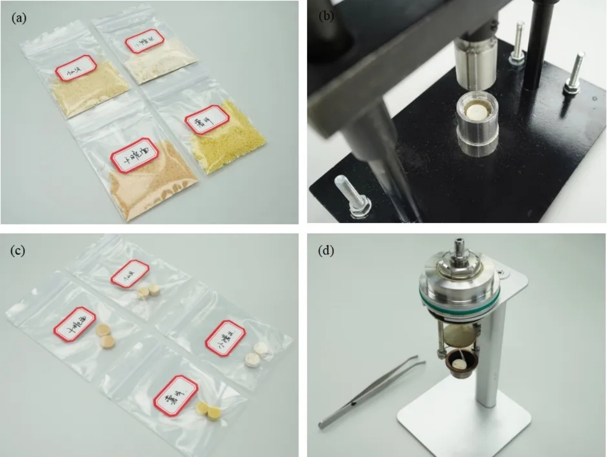 Figure 3: Sample Pre-treatment (a) Crushed Samples (b) Display of Small Steamed Bun Pellets (c) Pelletized Samples (d) Sample Loading