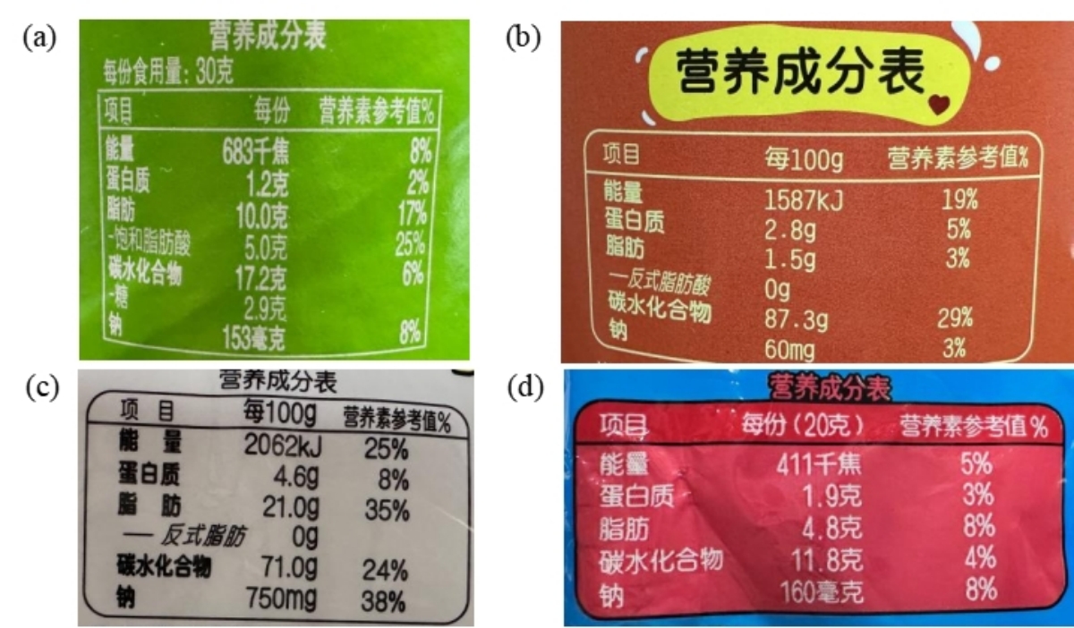 Figure 4: Nutritional Information on Packaging (a) Potato Chips (b) Small Steamed Buns (c) Rice Crackers (d) Crispy Noodles