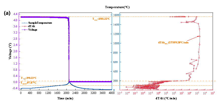 Based on our years of practical experience in lithium-ion battery testing, higher energy density typically correlates with a more severe thermal runaway process.This characteristic can be quantified and observed through data such as the sample’s temperature rise rate, peak temperature during thermal runaway, and video recordings of the event. Thermal runaway testing of high-energy-density lithium-ion batteries has always been challenging in adiabatic calorimetry. Due to their rapid temperature rise, high peak thermal runaway temperature, short duration, and intense energy release, key data points can be missed if acquisition is not timely, and the accuracy of test data may be compromised, potentially even damaging the testing equipment.