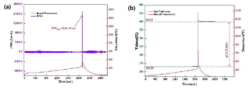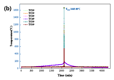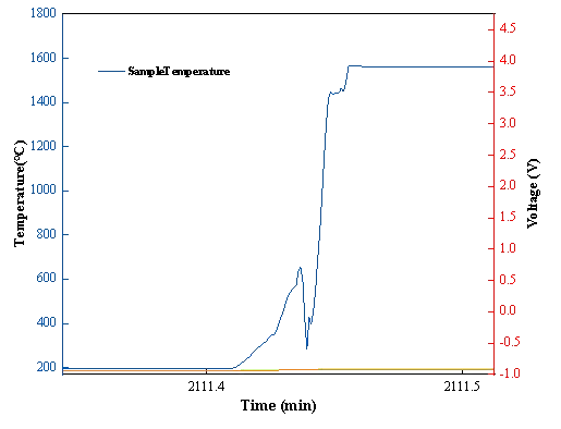 Analysis of the temperature data in Figure 2 and the gas evolution rate and volume data in Figure 3 reveals an extremely violent thermal runaway event. A close examination of the sample temperature curve shows that the entire thermal runaway process, from onset to conclusion, lasted less than 3 seconds, during which the temperature increased by over 1300 ℃. The temperature rise rate exceeded 200,000 ℃/min. Meanwhile, the gas data indicates that the peak gas evolution rate during thermal runaway surpassed 15,000 L/min, demonstrating the intense impulsive force characteristic of lithium battery combustion and explosion.