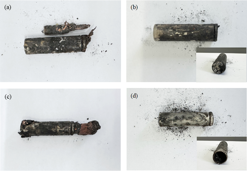 Figure 4. Post-thermal runaway conditions of 18650 lithium-ion batteries: (a/b/c) at 0% SOC and (d) at 100% SOC